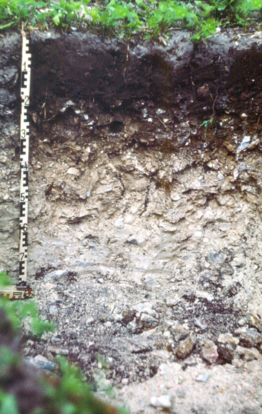 RZns z vápenců (14) – L; hluboký melanický horizont (Am) ve vápencové suťi, postupně prohumózněná suť až kompaktní vápenec(R) (f.N)
